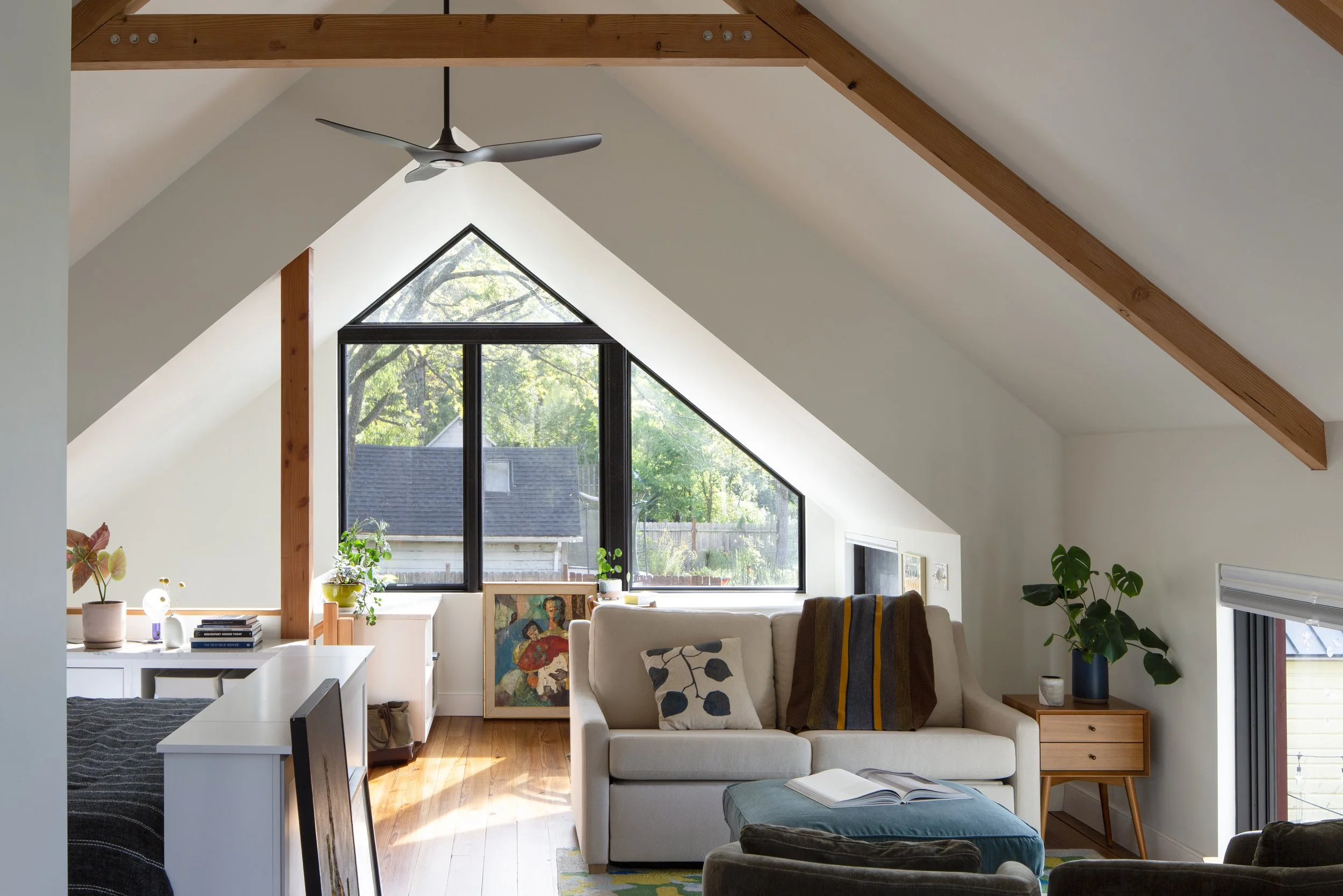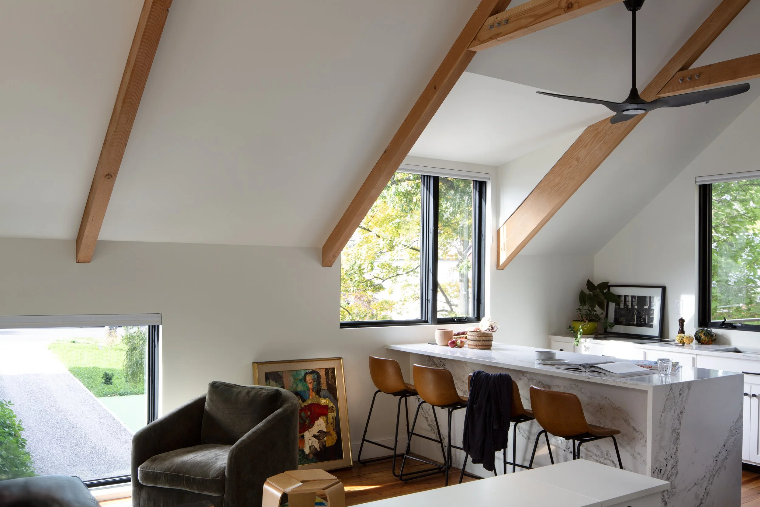 An existing barn on a residential street in the heart of New Paltz needed a full rebuild, but the form and aesthetic of the historic building guided the design for this rebuilt ADU. The new guest space, garage and workshop brings new life and functionality where there had been a crumbling structure.